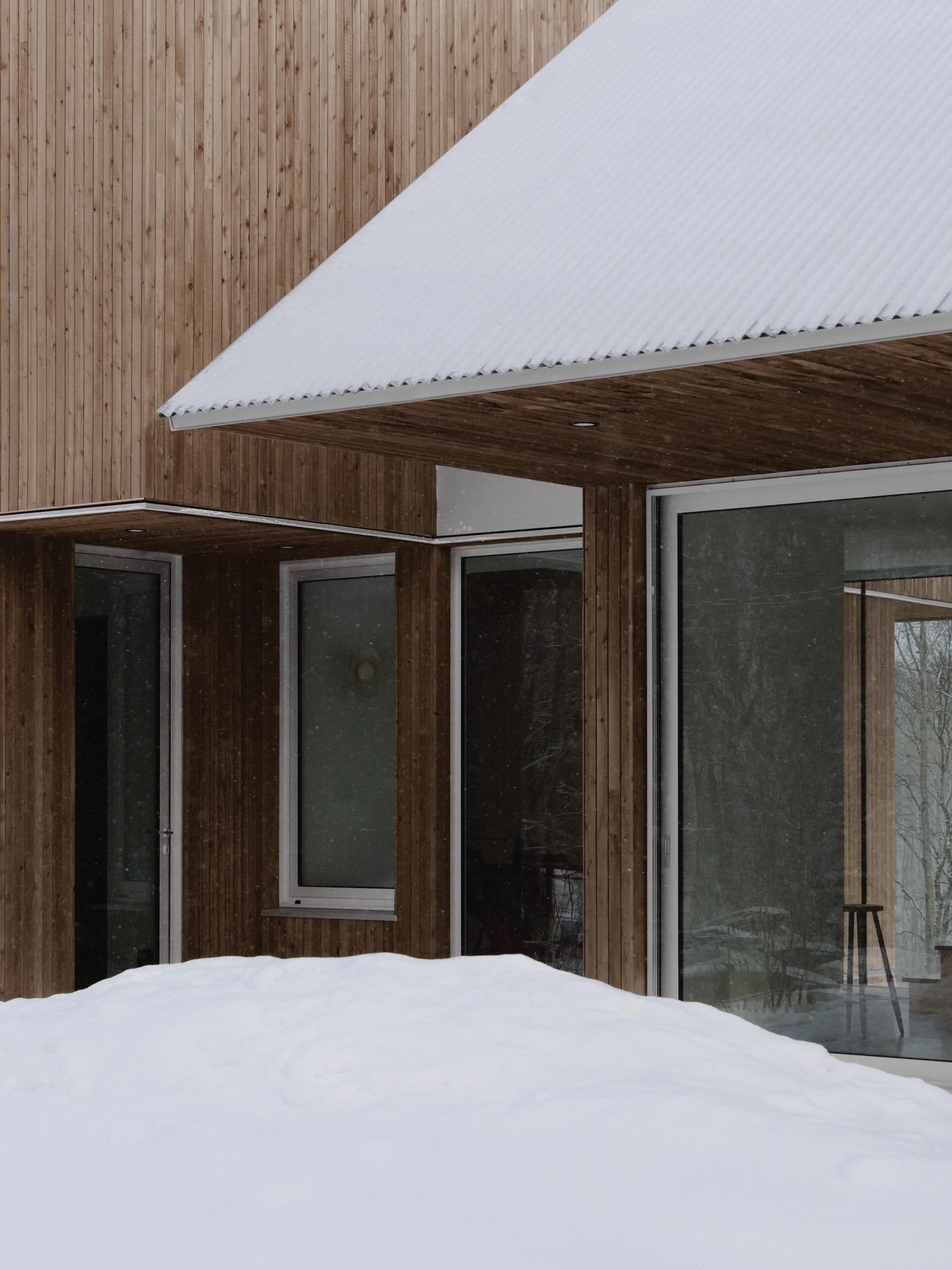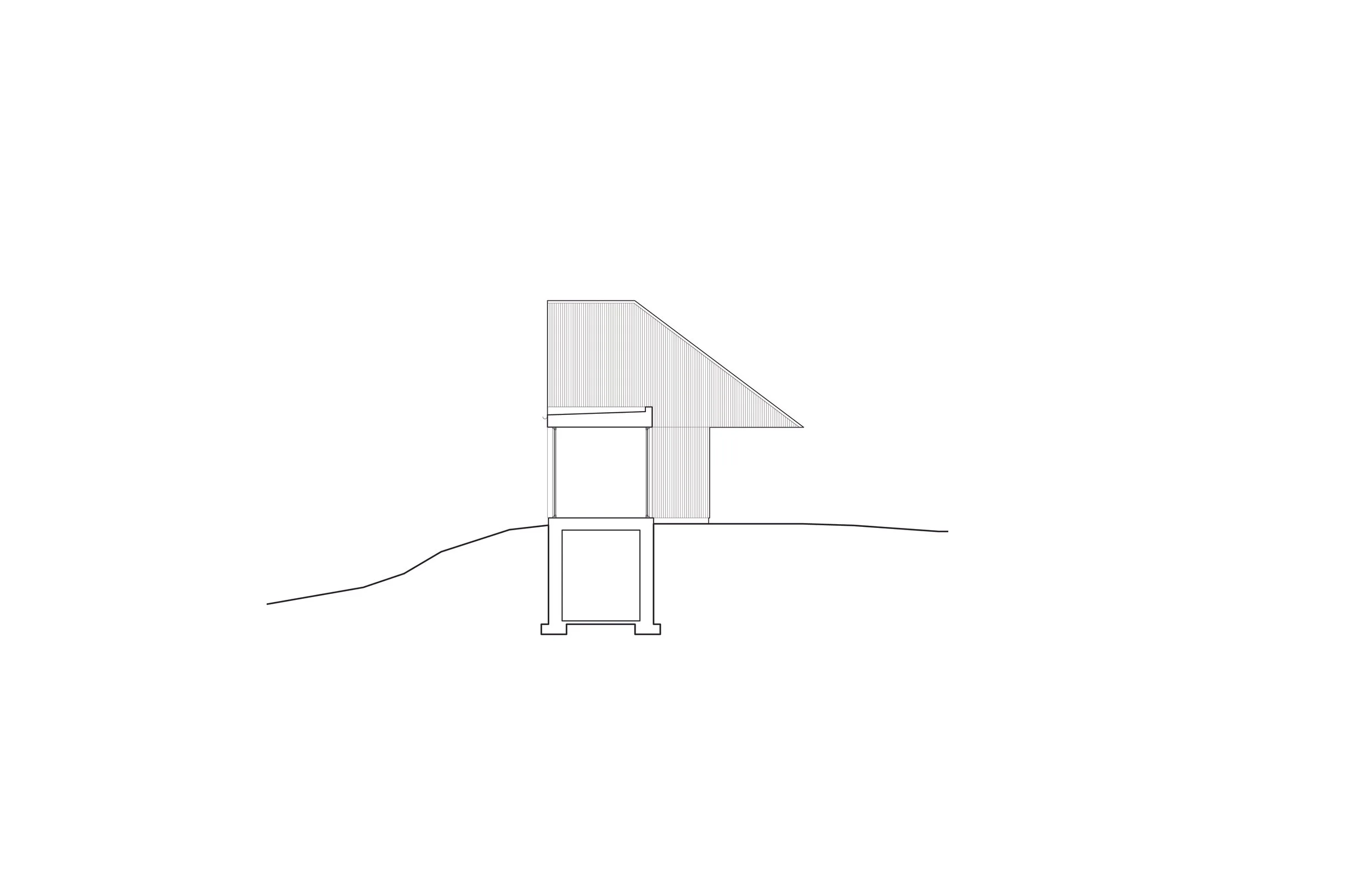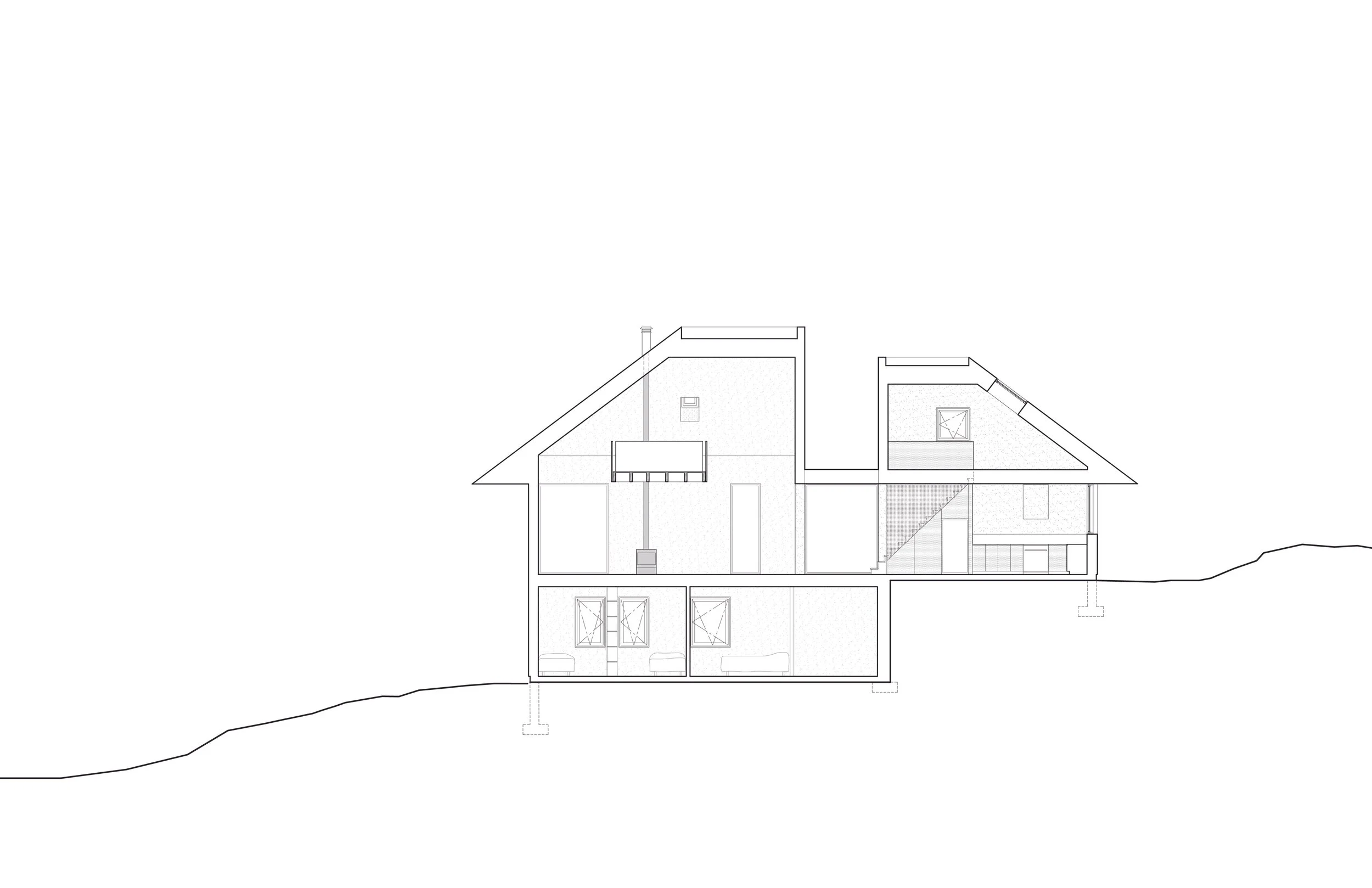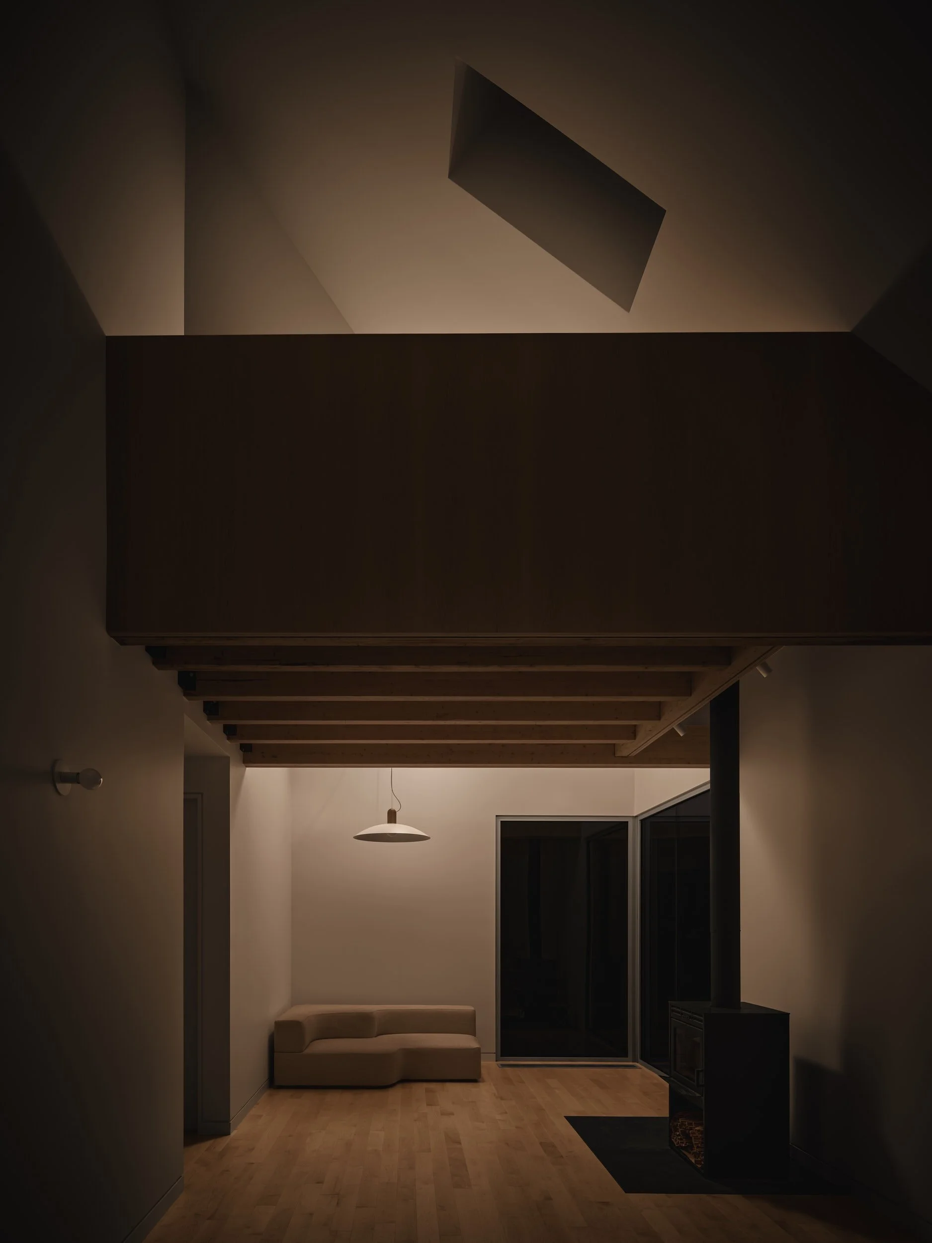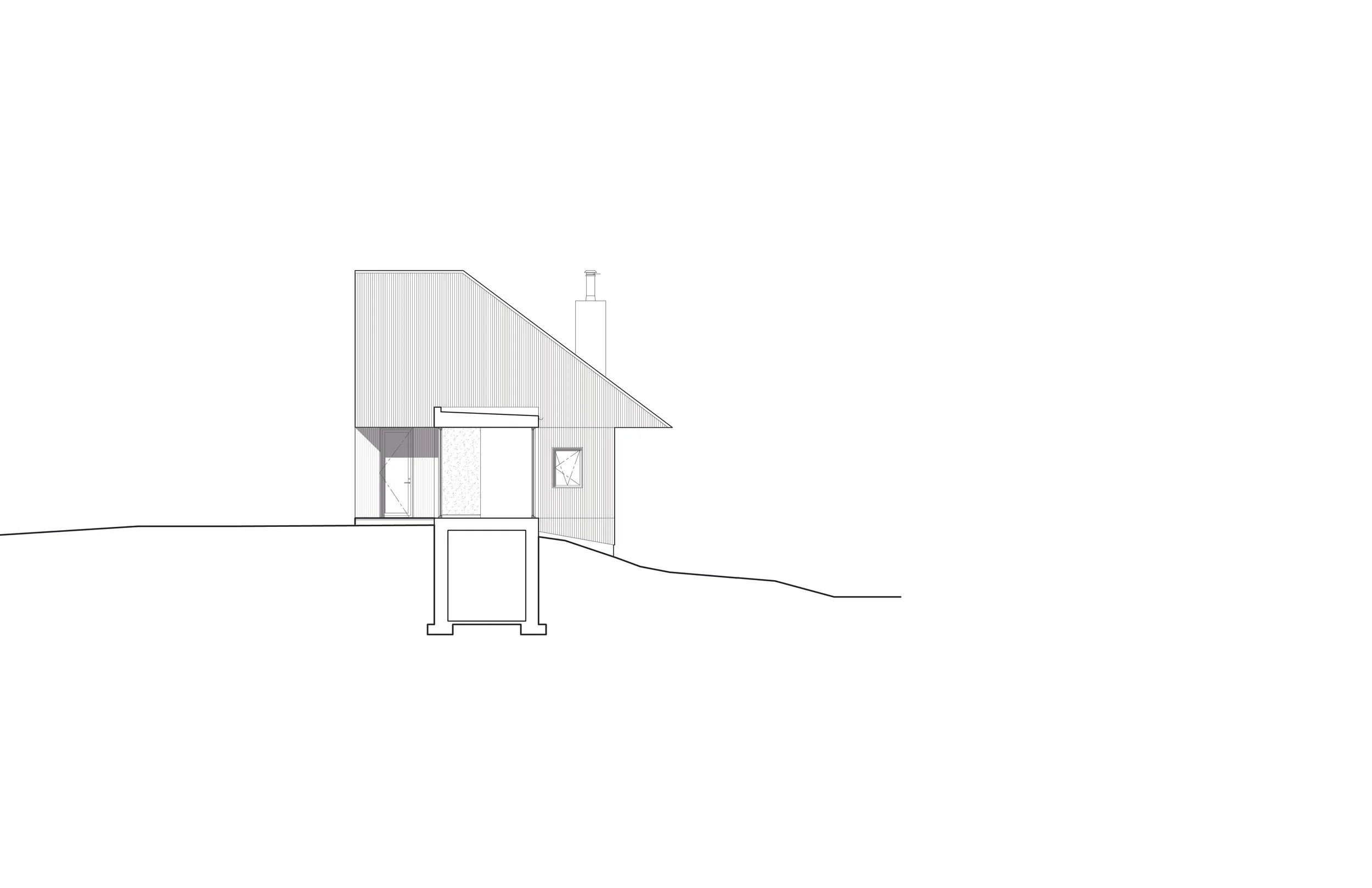 The smaller volume contains a generous kitchen opening onto an impressive all-wood structure cantilever protecting a south-facing terrace. A perforated wood screen conceals the stair leading to a painting studio and seasonal greenhouse. The larger volume makes up the remaining communal program on the ground floor. The bedrooms and main bathroom are located below, in a walk-out basement partially carved into the hill.
