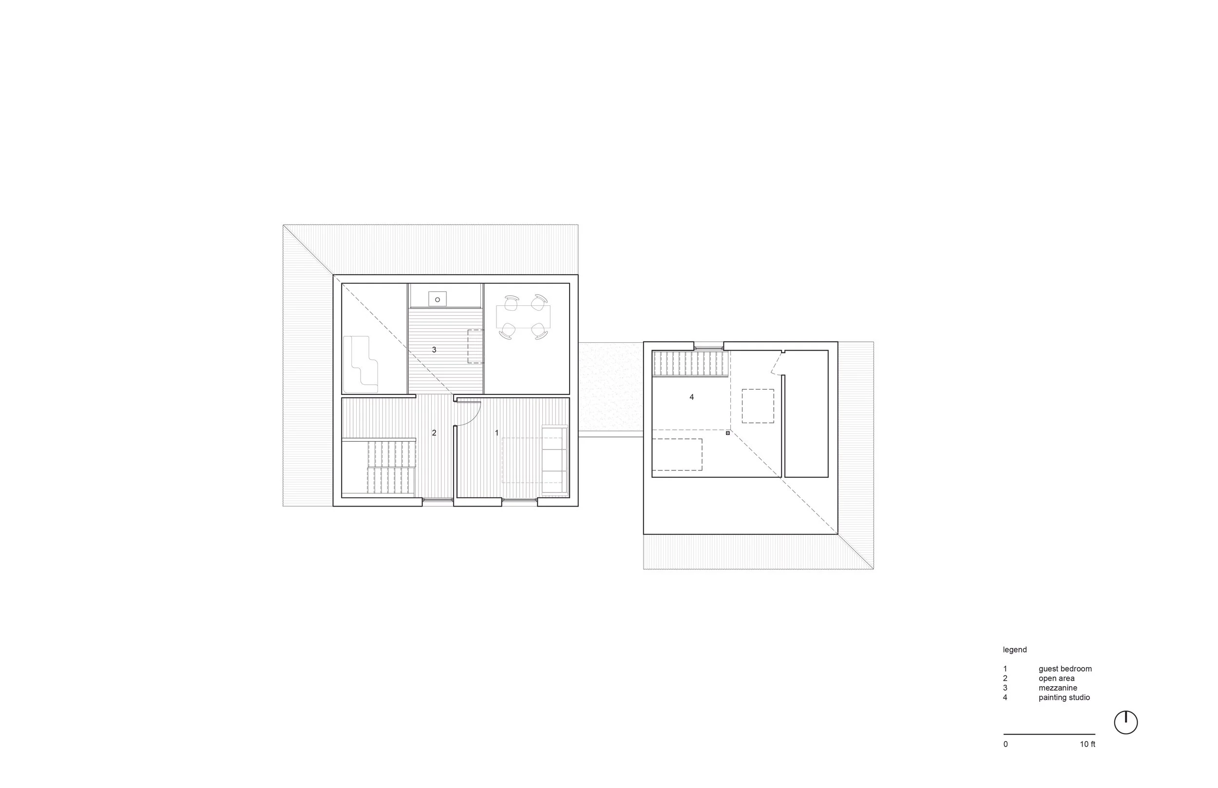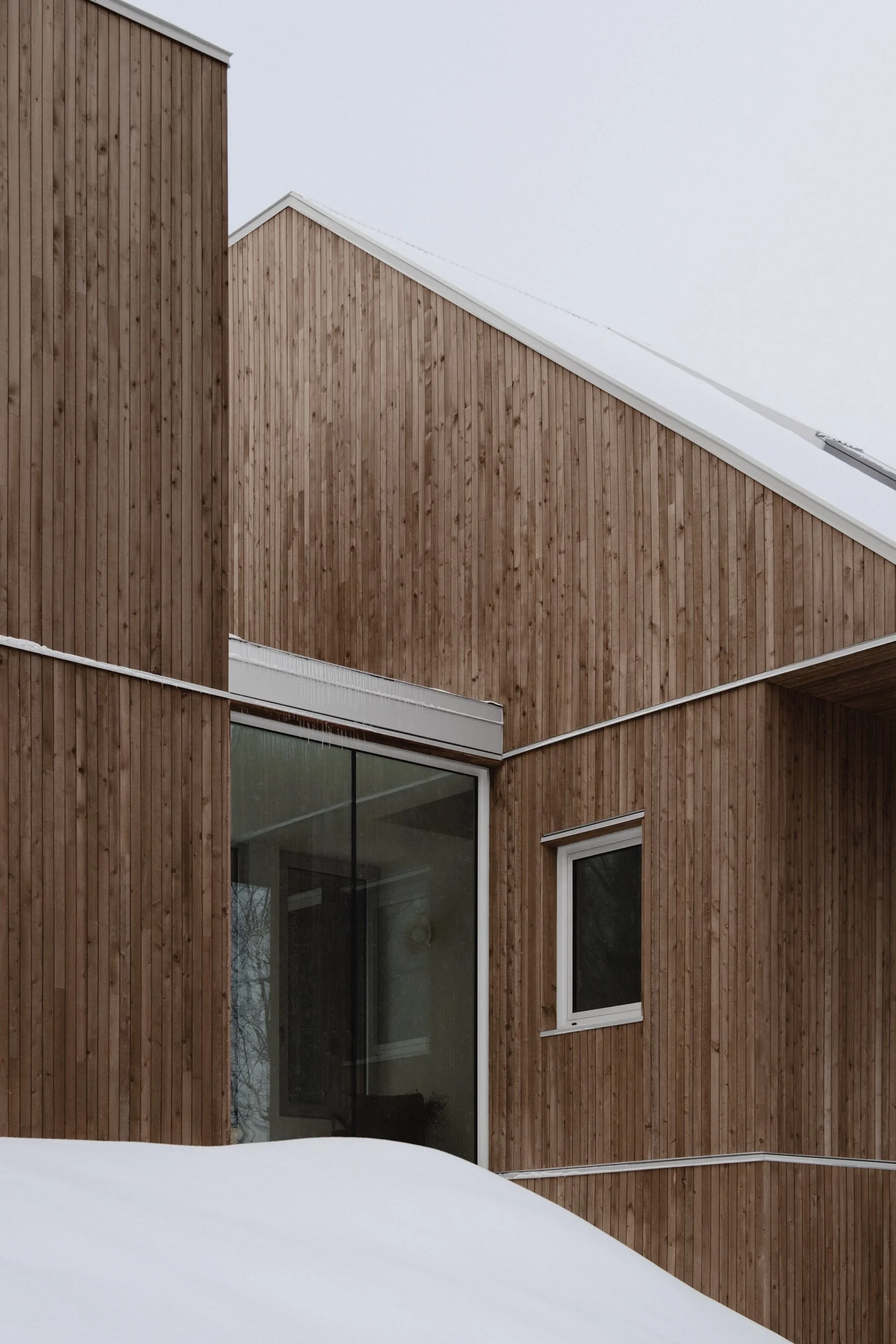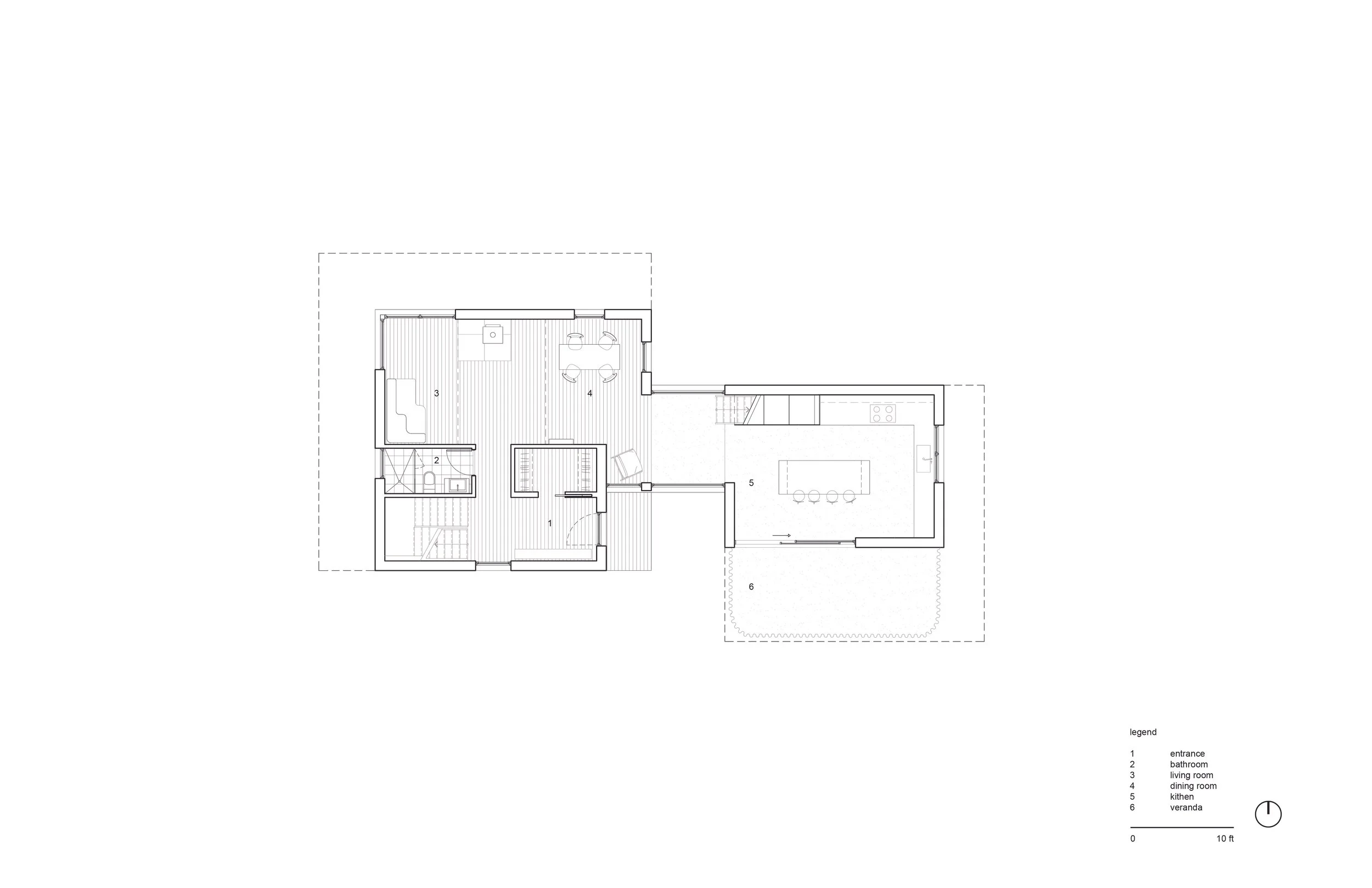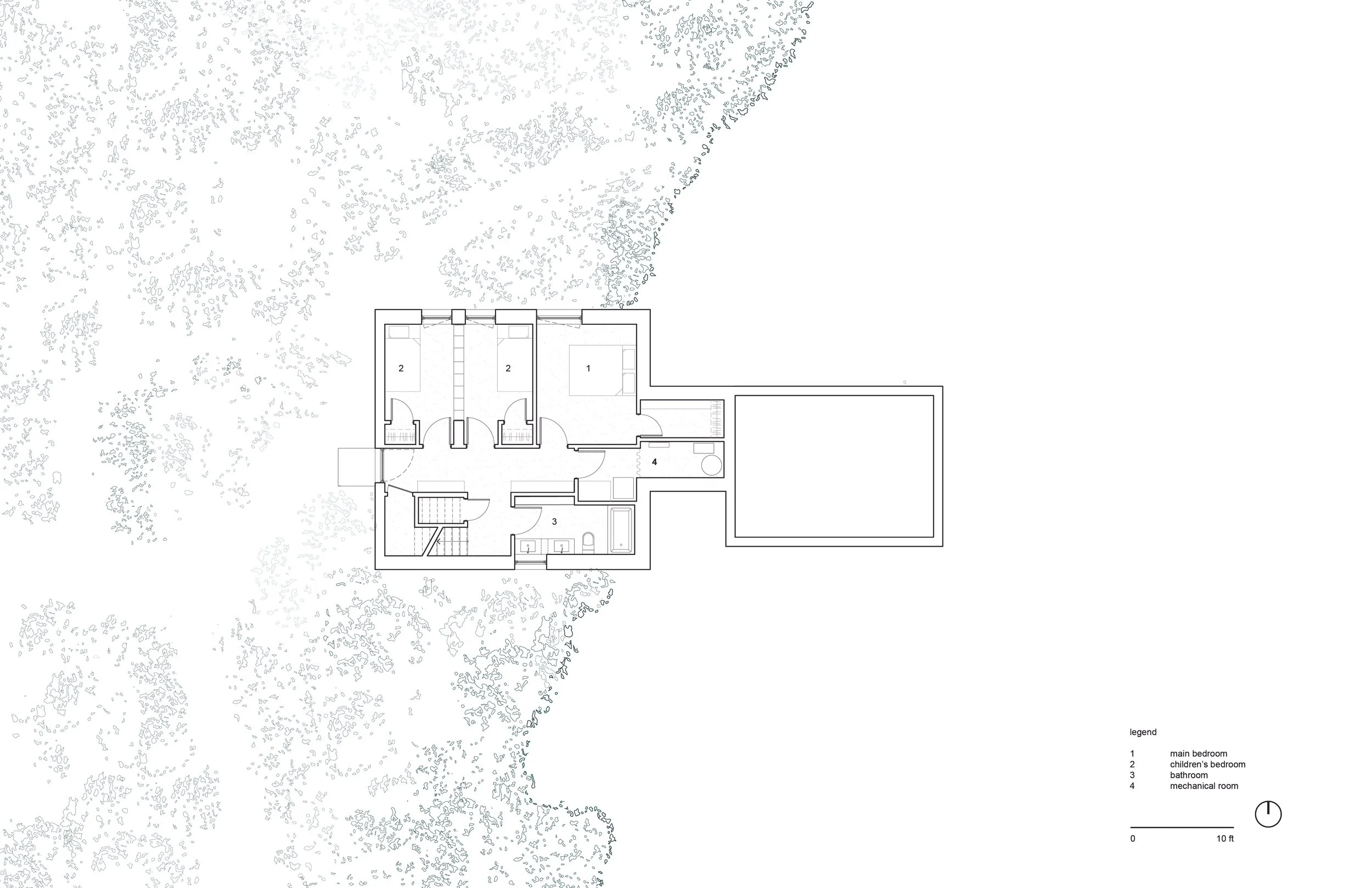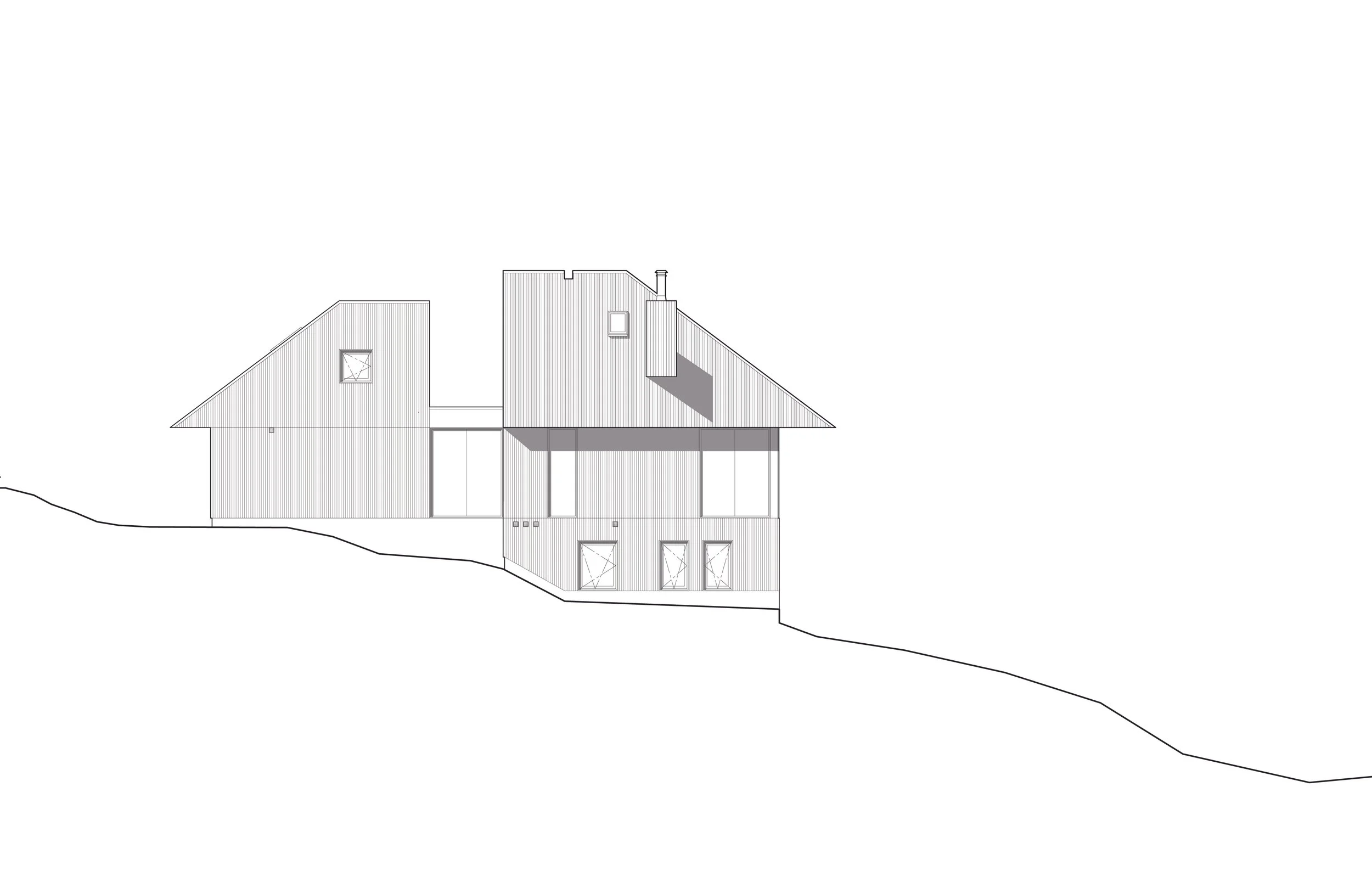 The smaller volume contains a generous kitchen opening onto an impressive all-wood structure cantilever protecting a south-facing terrace. A perforated wood screen conceals the stair leading to a painting studio and seasonal greenhouse. The larger volume makes up the remaining communal program on the ground floor. The bedrooms and main bathroom are located below, in a walk-out basement partially carved into the hill.