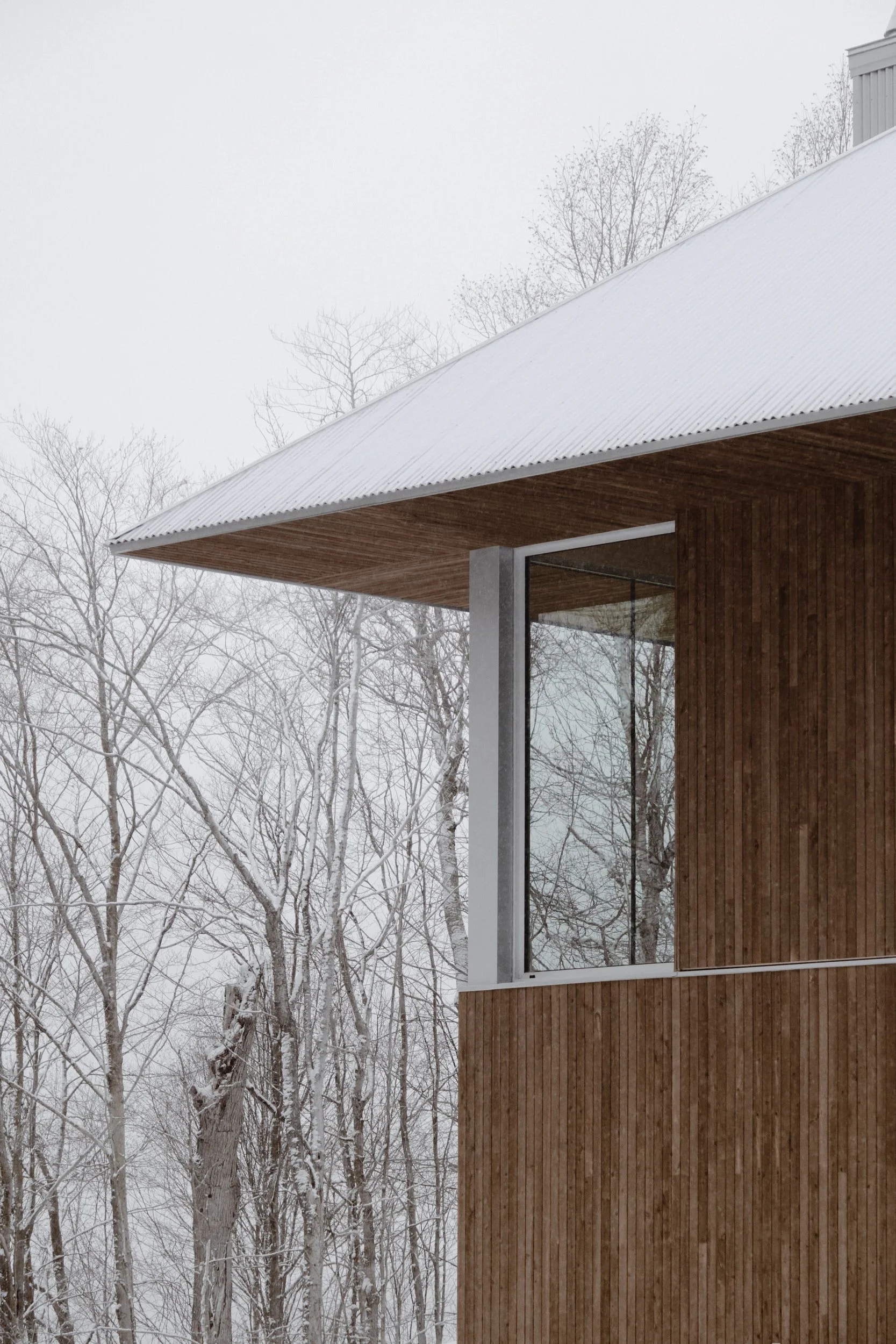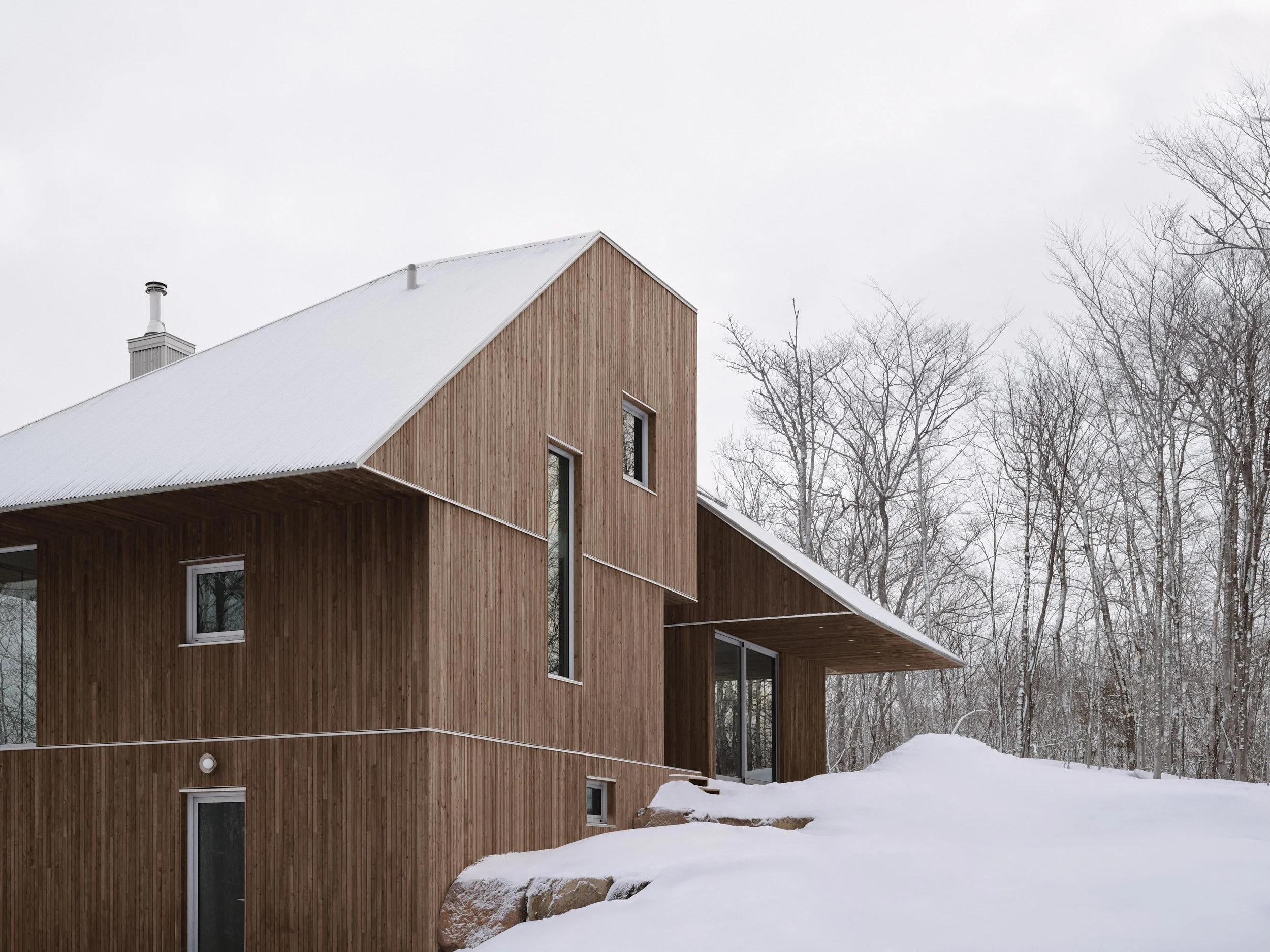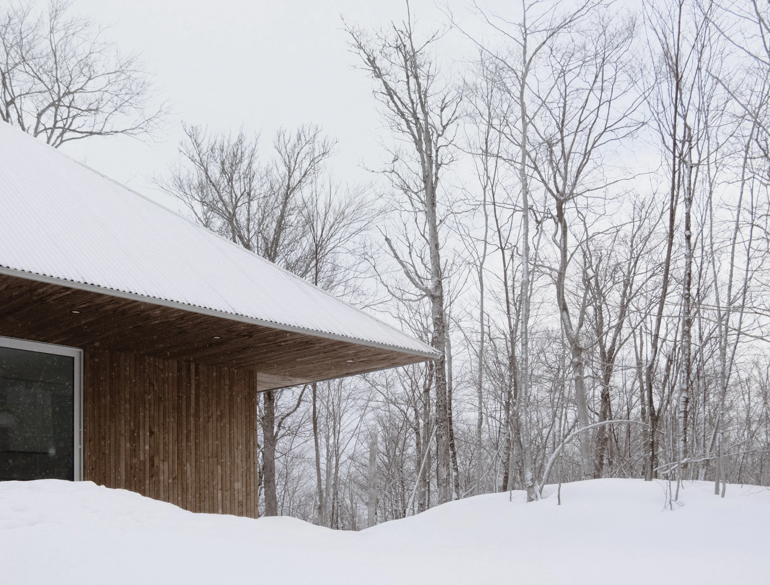 Located in the wooded, mountainous region of the Laurentians, Quebec, the piece of land presented by the clients posed significant challenges from the outset of the project. Only a small buildable footprint remained once zoning setbacks, environmental factors and a minimum of privacy from the road were considered. The result is an area of land defined by its nearly 45% slope.