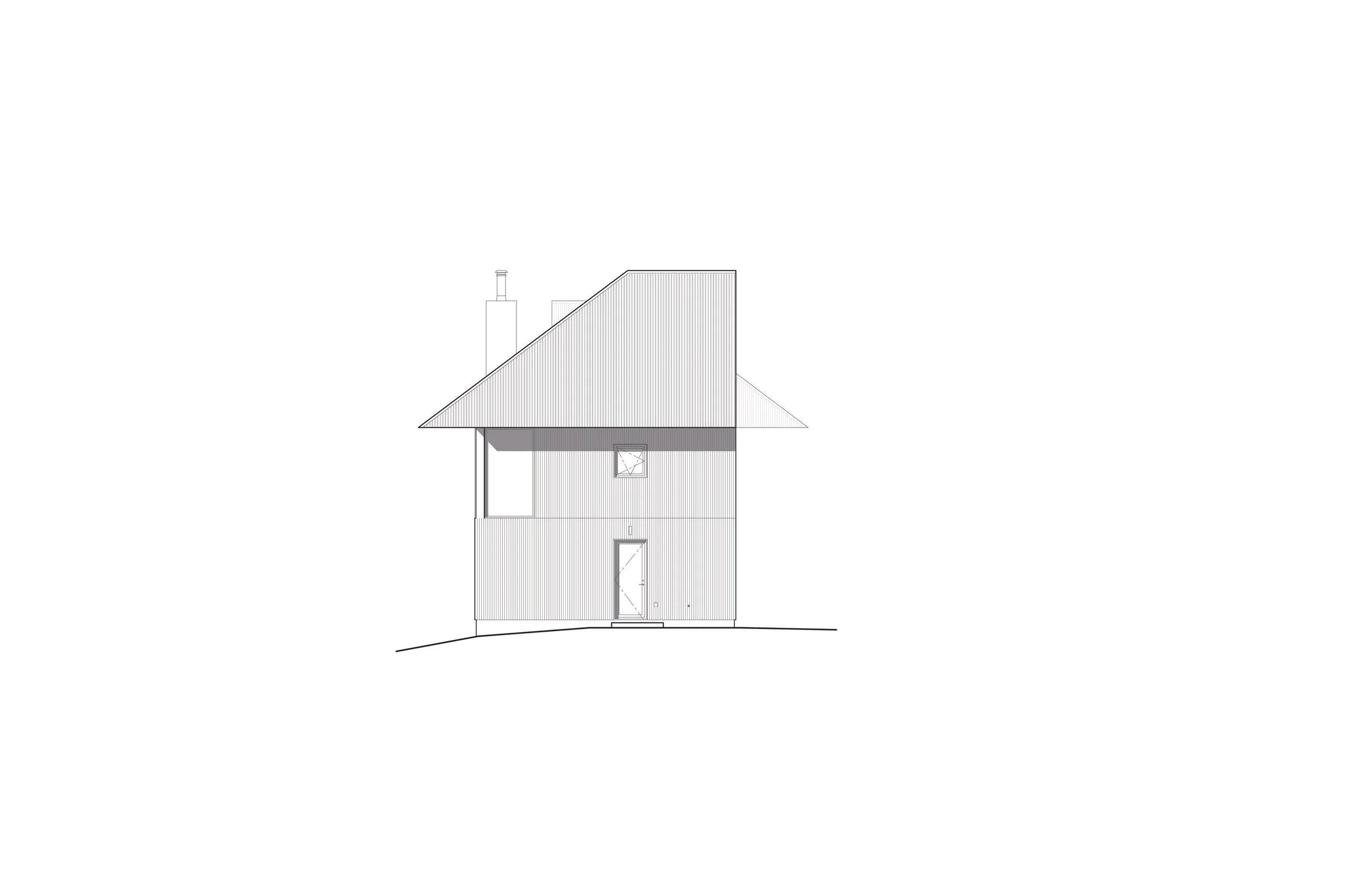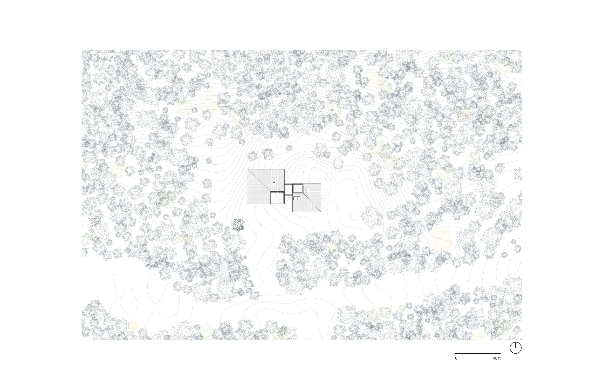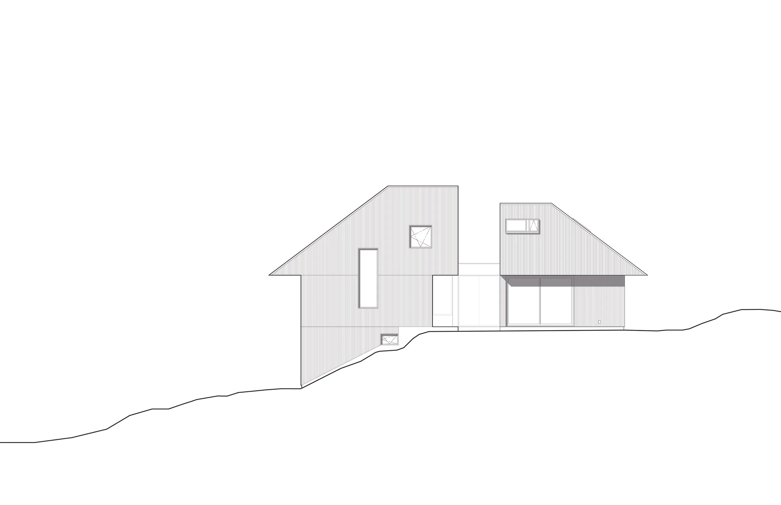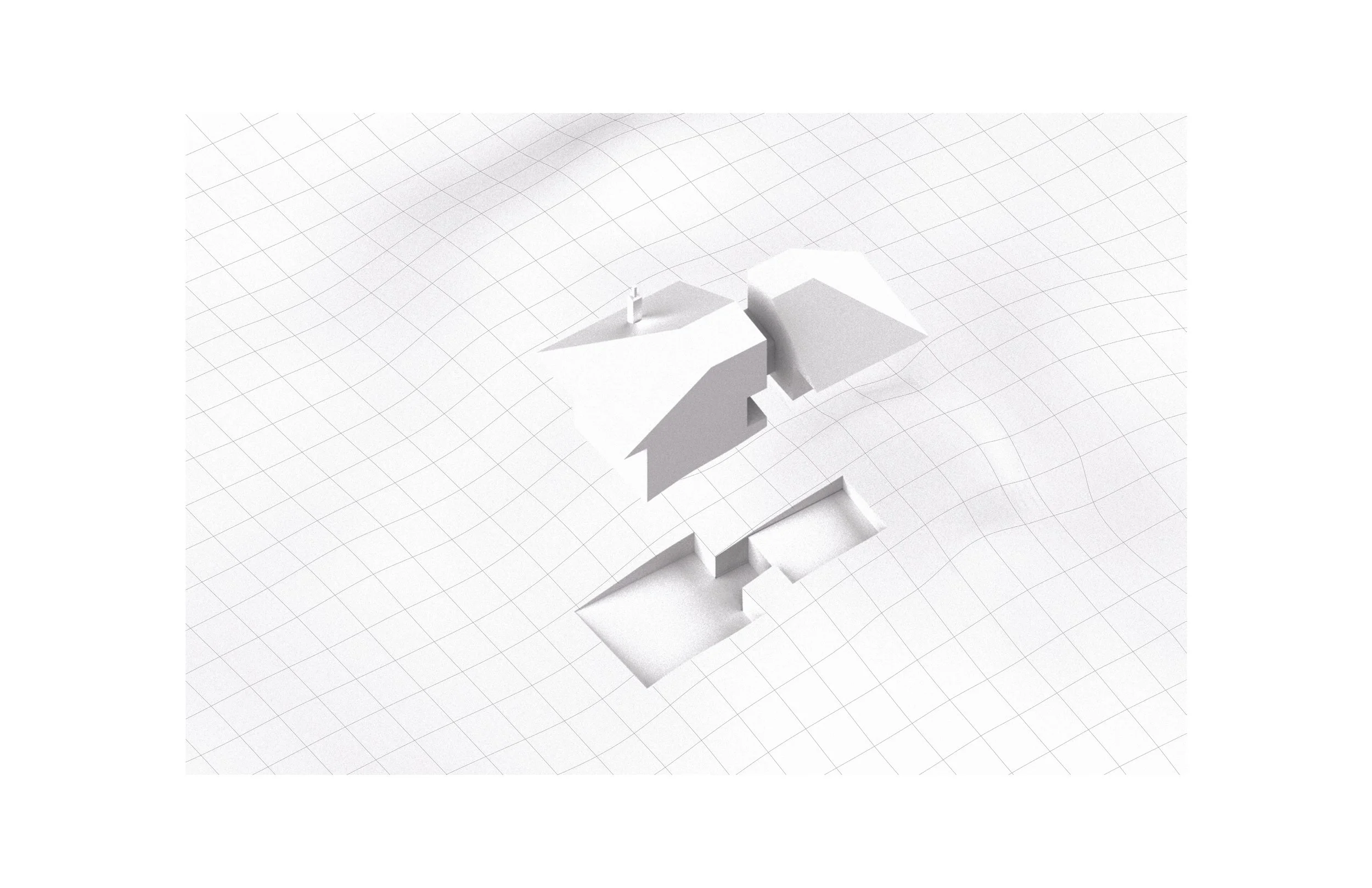 The starting morphology, a typical rectangular plan with a hip roof, is methodically transformed during the design process through a series of operations. The volume is split, rotated and scaled, slowly adapting the program to the site and context. The resulting twin shapes sit toward the high point of the lot, nestled into the rocky terrain towards the east while framing dramatic views to the north-west.